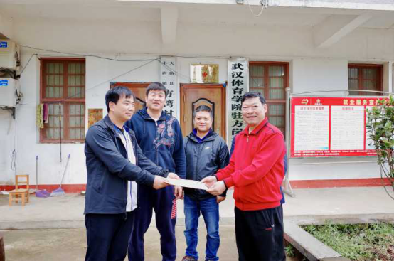 在扶贫点驻地,童铸书记、赵露娜副书记向方岗村捐赠了8800元的扶贫款。童书记说,这笔钱是我院教师自愿捐赠的,代表了武汉体育学院新闻传播学院党员教师的一片心意,看到村里的扶贫工作有序开展,贫困户也都纷纷脱贫,为大家的辛苦付出和努力工作感到由衷的高兴,也深刻领悟到习近平总书记提出的“精准扶贫”决策的英明。方岗村村主任谈硕表示,感谢武汉体育学院新闻传播学院的资助,他们将妥善使用这笔捐款,首先将按照村里的贫困人口进行分配,其次,剩余部分将用于村西边河道绿化。