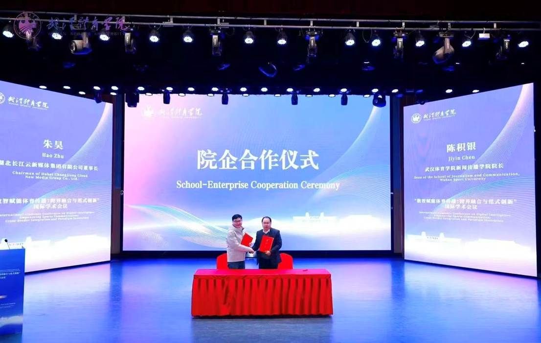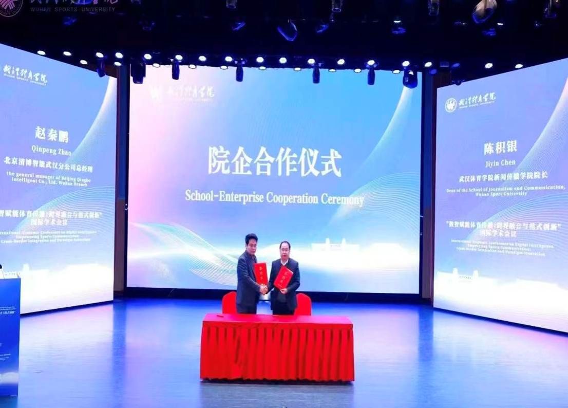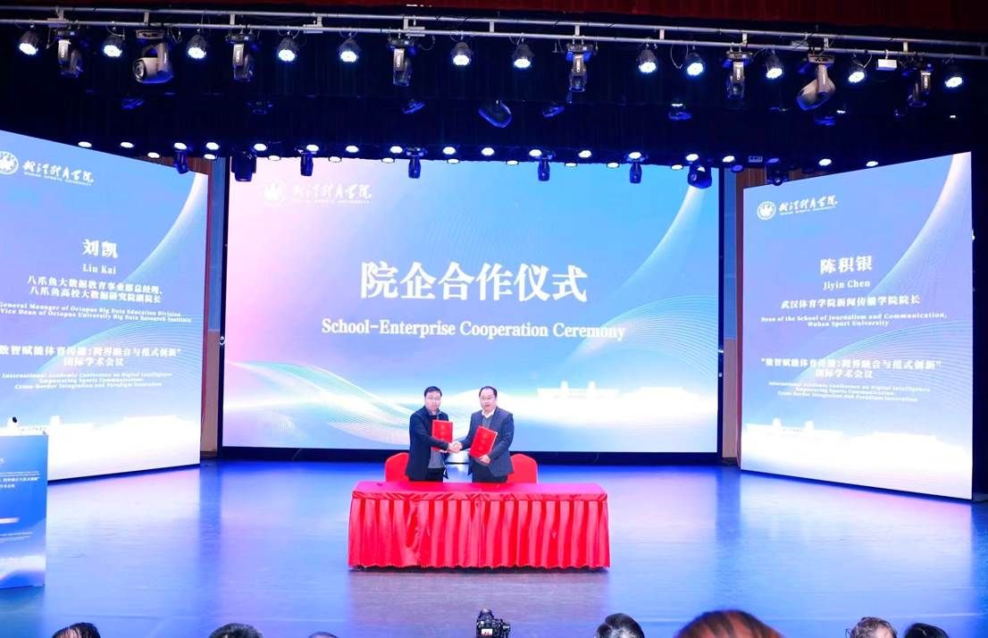 院企合作环节,武汉体育学院新闻传播学院院长陈积银作为学院代表,与中国传媒大学出版社、湖北长江云新媒体集团、北京清博智能、湖北广播电视台、八爪鱼大数据等单位举行签约仪式,旨在搭建产学研协同创新平台,推动智能体育传播技术成果转化与人才联合培养,实现高校与行业的资源共享、优势互补。