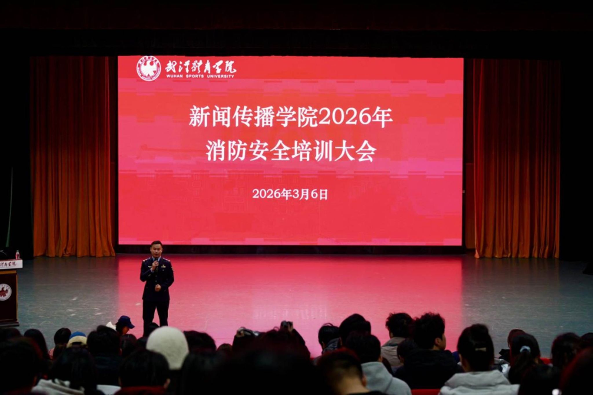 为切实加强校园消防安全管理,提升全体师生安全意识与应急处理能力,进一步筑牢消防安全防线,2026年3月6日,新闻传播学院特邀武汉江城消防教官,面向全院师生开展一场以“防患于未然,共筑身心防火墙”为主题的专题培训。学院全体辅导员和学生参与本次培训。