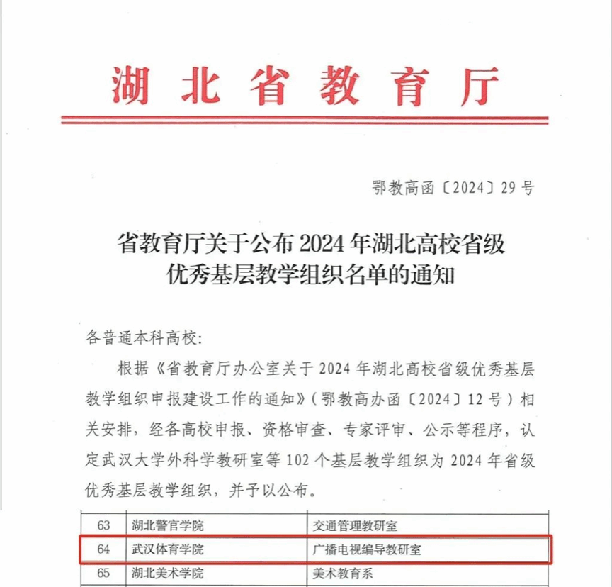 近日,湖北省教育厅发布了《省教育厅关于公布2024年湖北高校省级优秀基层教学组织名单的通知》(鄂教高函 〔2024〕29号),新闻传播学院广播电视编导教研室获批2024年省级优秀基层教学组织。这是继新闻学教研室获得“省级优秀基层教学组织”“巾帼文明岗”,播音与主持艺术教研室获得“省级优秀基层教学组织”后,我院获得的第四个基层教学组织省级荣誉。