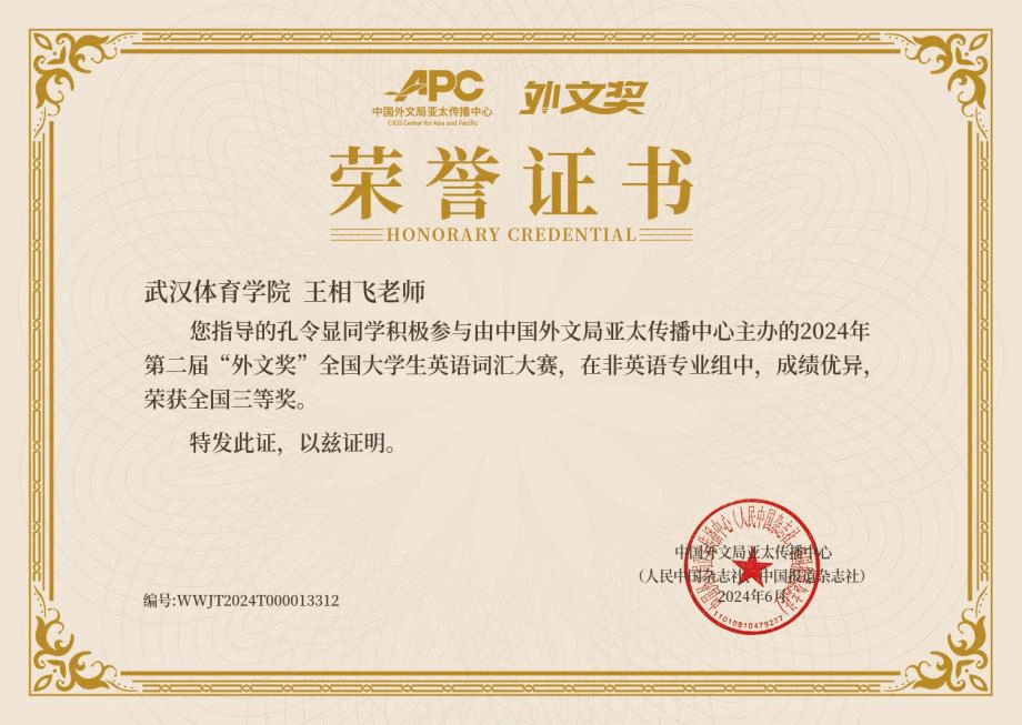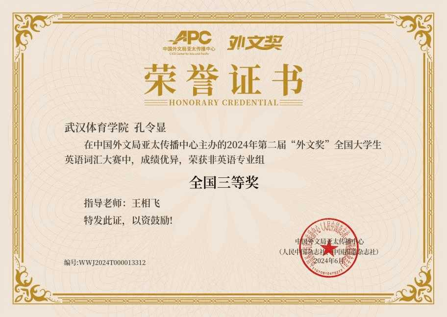 6月22日,由中国外文局亚太传播中心(人民中国杂志社、中国报道杂志社)主办的2024年第二届“外文奖”全国大学生英语词汇大赛落下帷幕。新闻传播学院2023级研究生孔令显成绩优异,获非英语专业组全国三等奖,王相飞获优秀指导老师。