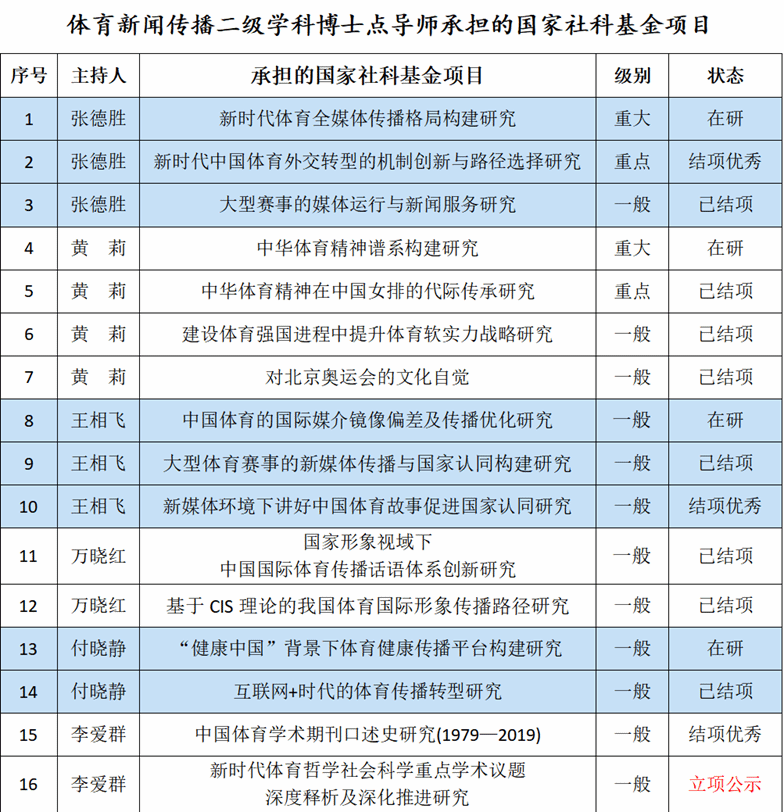 12月17日,全国哲学社会科学工作办公室公示了《2024年国家社会科学基金后期资助立项名单》,武汉体育学院李爱群教授的研究成果成功入选。截至目前,我校体育新闻传播学二级学科博士点现有的6位博士生导师均主持承担了2个以上的国家社科基金项目。